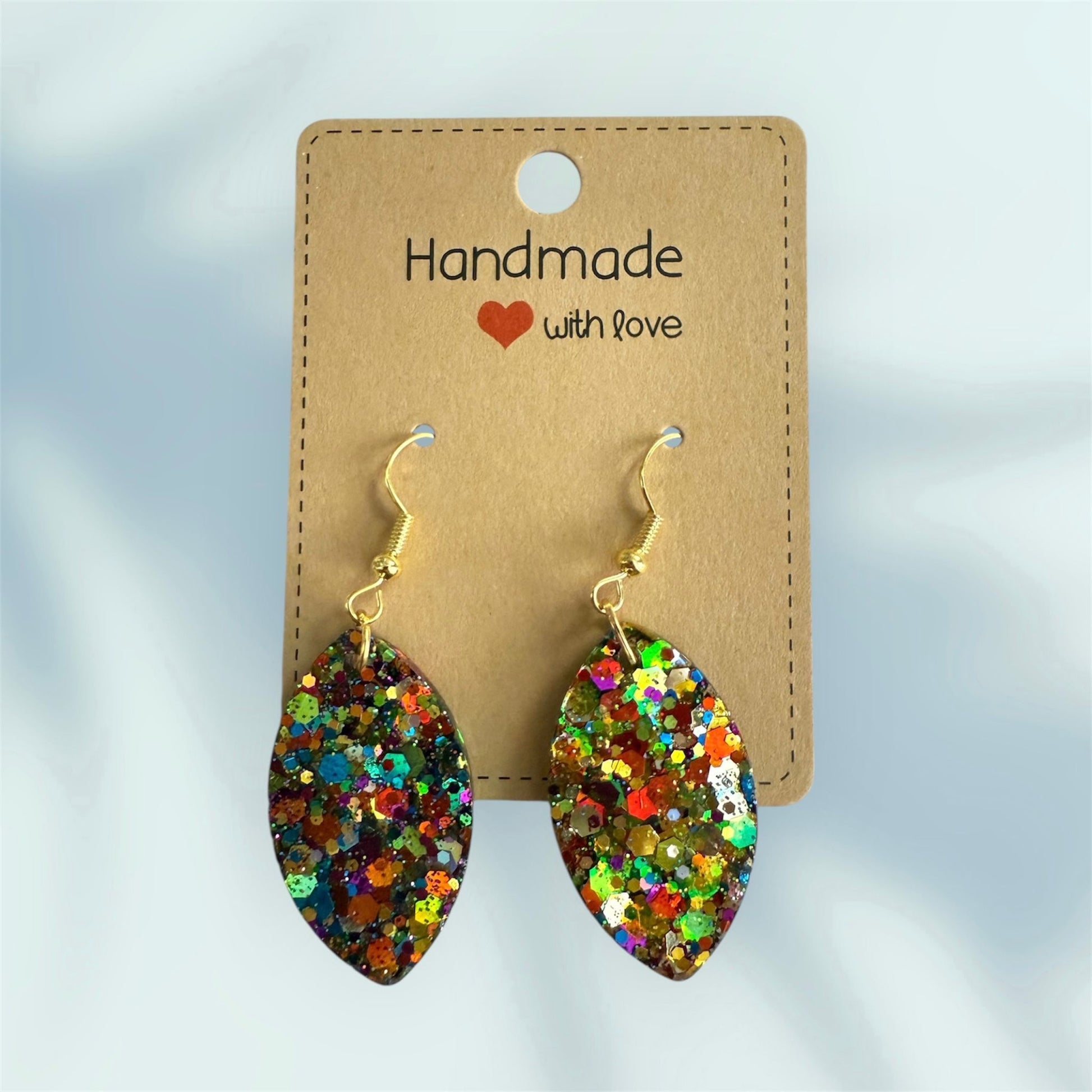 Handmade glittery resin earrings in a bold leaf shape. Lightweight, eye-catching, and perfect to add sparkle to your outfit. Unique and fun accessory!