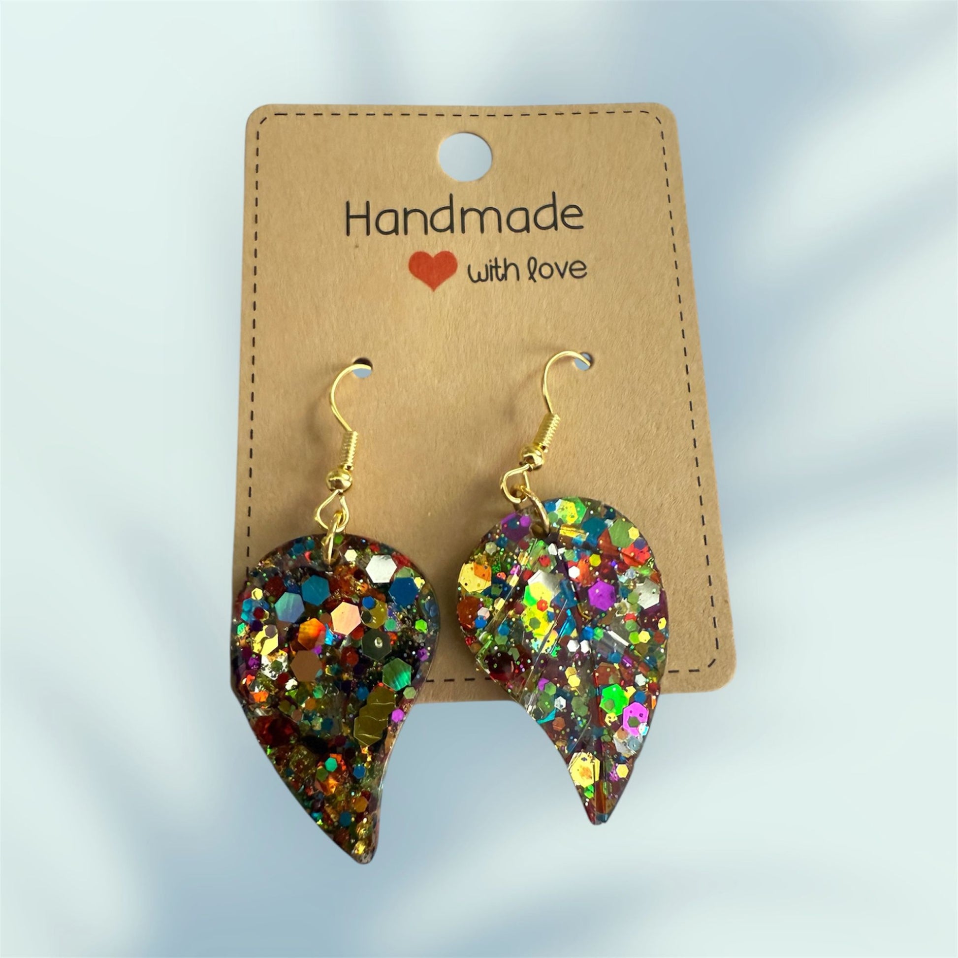 Bold and bright resin leaf earrings packed with glitter. A handmade statement piece that brings color and joy to any look.