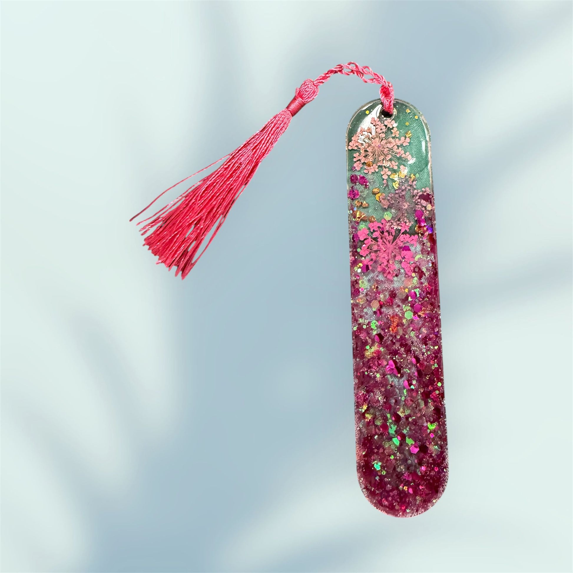 Segnalibro in resina con fiori rosa, per letture delicate e romantiche.